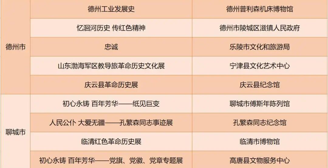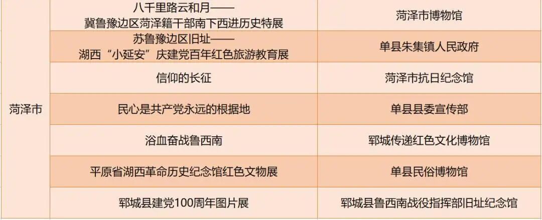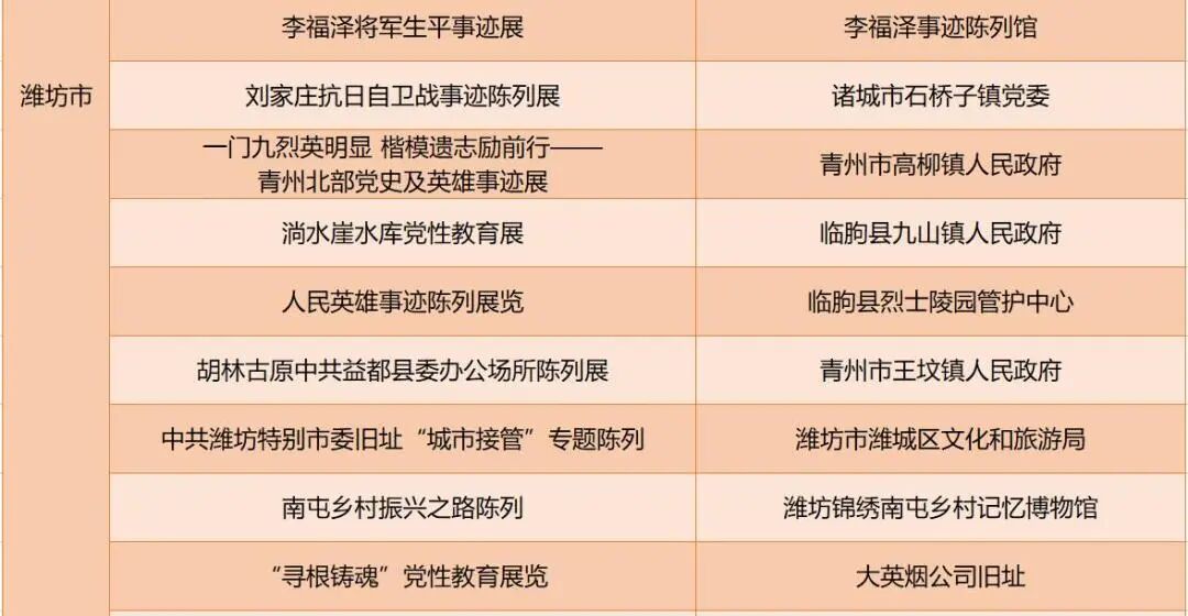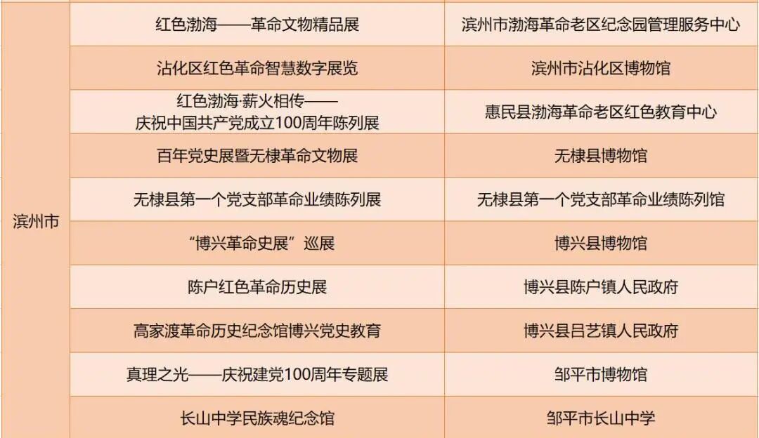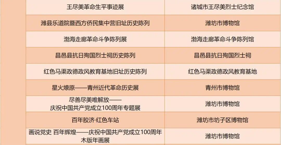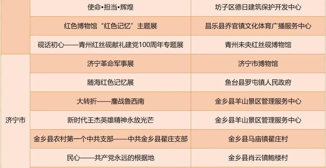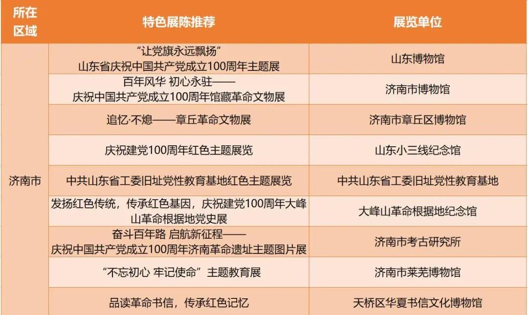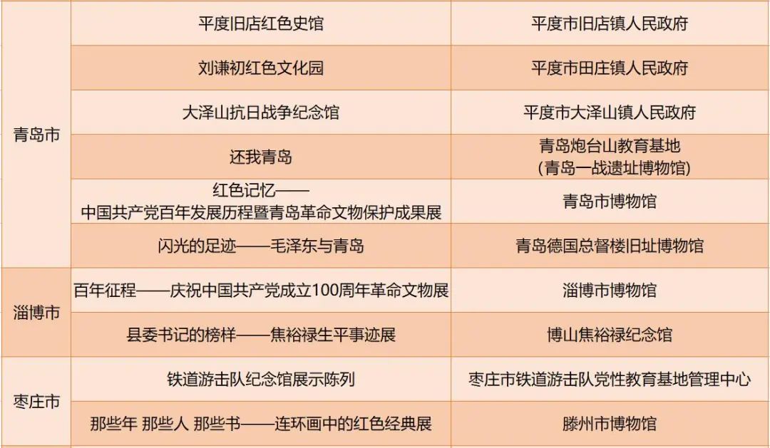為深入貫徹落實習近平總書記對革命文物工作的重要指示精神,充分展示我們黨的百年偉大成就和寶貴經驗,充分發揮革命博物館、紀念館作為黨和國家紅色基因庫的重要作用,省文化和旅游廳以中國共產黨領導中國人民進行革命、建設和改革的100年奮斗歷程為主線,依托山東紅色文化資源,在全省范圍內遴選了“讓黨旗永遠飄揚”山東省慶祝中國共產黨成立100周年主題展等100家革命場館特色展陳。推介名單如下: