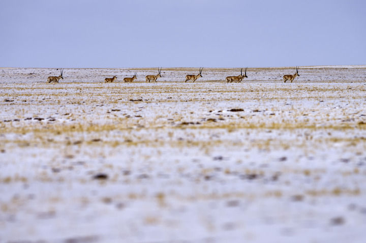 今年4月,大量藏羚羊匯聚可可西里五道梁地區(qū),踏上遷徙之路。(新華社記者費茂華攝)