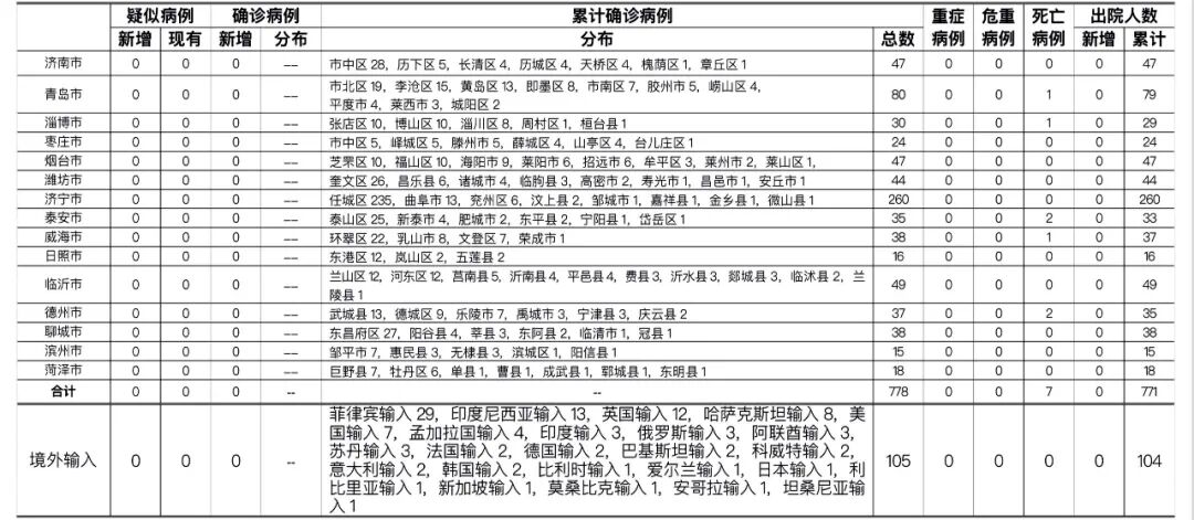 山東無新增本地疑似病例、確診病例。累計(jì)報(bào)告確診病例778例,死亡7例,治愈出院771例。