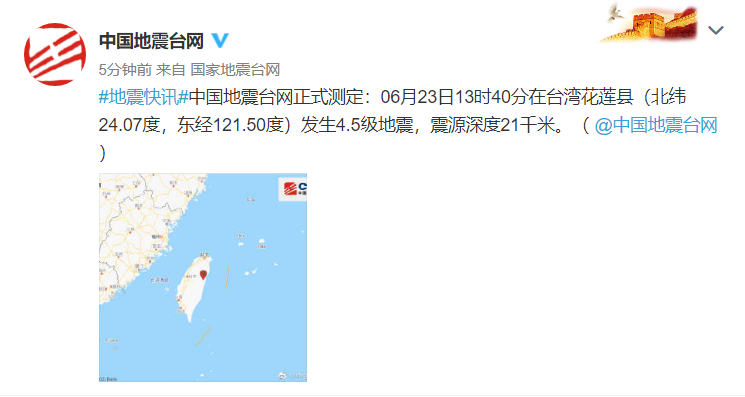 臺灣花蓮縣發生4.5級地震 2021-06-23 14:33 中國地震臺網微博 0 中國地震臺網正式測定:06月23日13時40分在臺灣花蓮縣(北緯24.07度,東經121.50度)發生4.5級地震,震源深度21千米。 微博截圖 責任編輯:王逸群