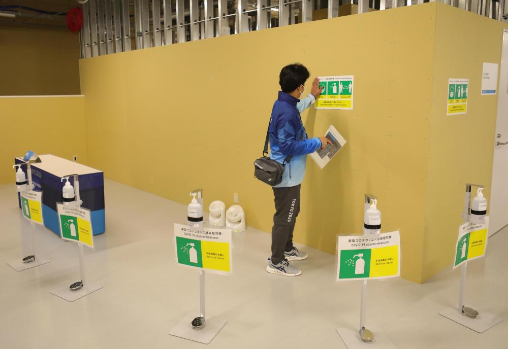 6月20日,工作人員在東京奧運會奧運村內張貼防疫標志。新華社記者王子江攝