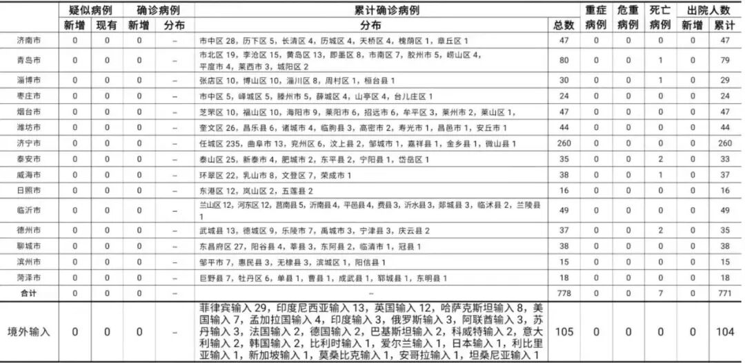 山東無新增本地疑似病例、確診病例。累計報告確診病例778例,死亡7例,治愈出院771例。