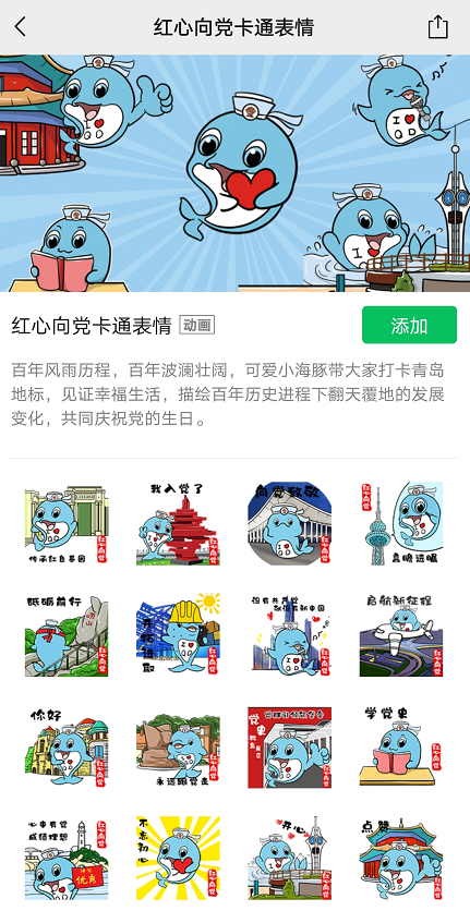 由中共青島市委網(wǎng)信辦與騰訊山東城市伙伴·青報(bào)微青島聯(lián)合出品的慶祝中國(guó)共產(chǎn)黨成立100周年專屬表情包“紅心向黨卡通表情”上線啦!打卡青島地標(biāo),見證幸福生活,跟著小海豚的足跡,表達(dá)對(duì)美好生活和祖國(guó)的深情祝福吧!