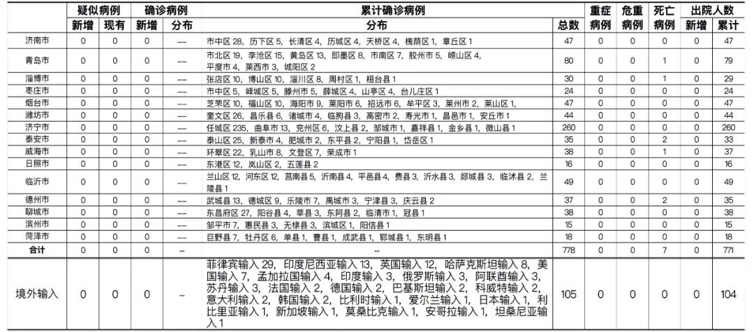 山東無新增本地疑似病例、確診病例。累計報告確診病例778例,死亡7例,治愈出院771例。