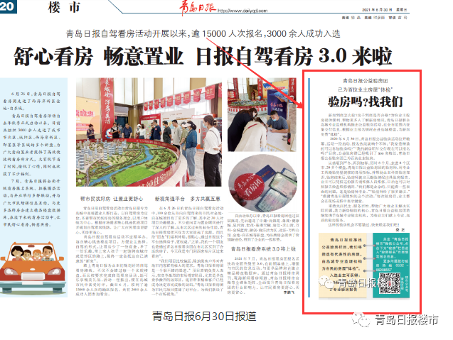 2020年6月30日,青島日報公益驗房活動拉開帷幕,活動一經啟動,報名熱線就響個不停:“我家是精裝的可以參加驗房嗎?”“我的新房明年交付現在可以報名嗎?”目前,公益驗房群已經吸引了500名粉絲,青島日報公益驗房團已為百余業主驗房。