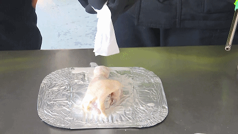 消防員找來雞腿模擬人的皮膚,再噴上防曬噴霧,