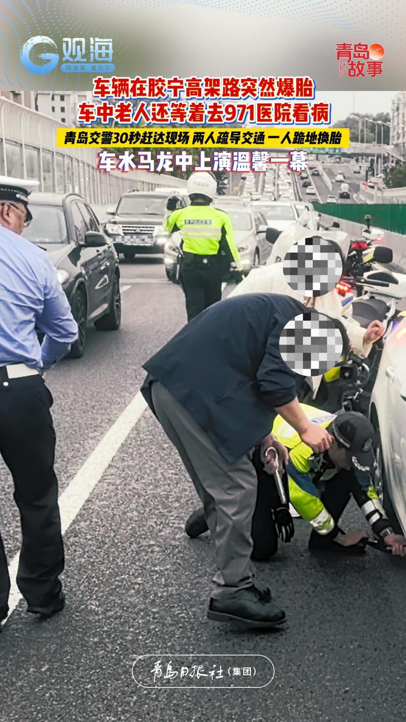 車流中最美一幕!青島交警跪地換胎,為就醫老人開辟“生命通道”